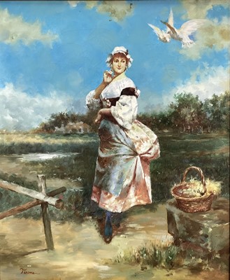 Lot 244Terome, 20th century, oil on canvas, young lady watching doves above her head, signed. 60 x 49cm.
