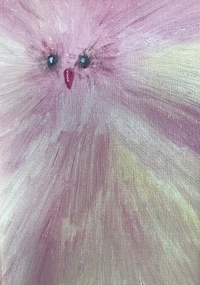 Lot 245Jesamine James, oil on board, "A Very Fluffy Chicken", signed and inscribed verso, in painted frame. 17 x 12cm.