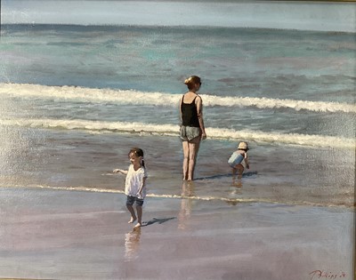 Lot 246Peter Z. Phillips, oil on canvas, A mother and her two children paddling in the surf, signed in gilt frame. 41 x 51cm.