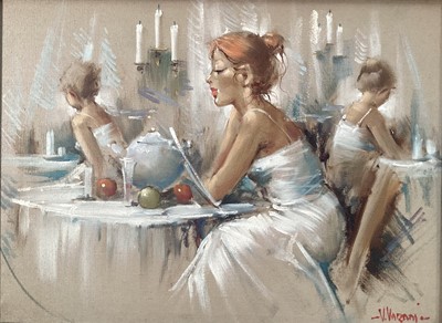 Lot 247V. Varam, oil on canvas, young lady in a white flowing dress seated at a table, signed, in gilt and painted frame. 30 x 40cm.