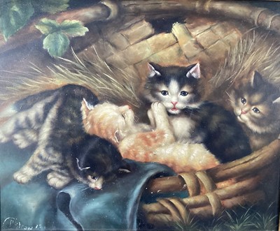 Lot 248English School, early 20th century, oil on board, Kittens in a basket, in gilt frame, indistinctly signed. 27 x 34cm.
