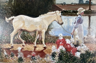 Lot 255After Sir Alfred J Munnings, oil on board, young lady leading a white pony along a river bank, in gilt frame. 49 x 75cm.