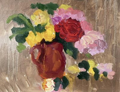 Lot 224Annelise Firth (b.1961) oil on canvas - 'Roses' still life, signed titled and dated 2024 verso, 35cm x 46cm, unframed