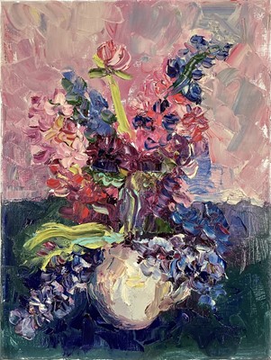 Lot 225Annelise Firth (b.1961) oil on canvas - 'Pink and Blue Hyacinths', signed titled and dated 2024 verso, 40cm x 30cm, unframed