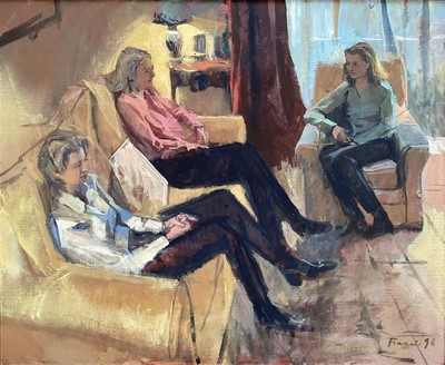 Lot 256Continental School 1997, Three seated figures in an interior, oil on canvas, indistinctly signed, in gilt frame. 59 x 72cm.