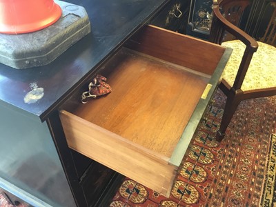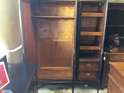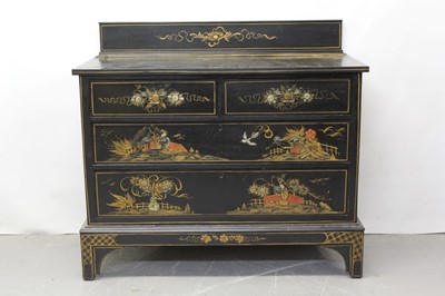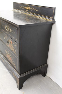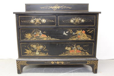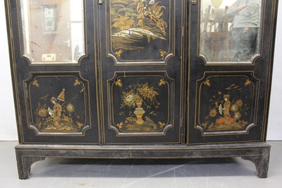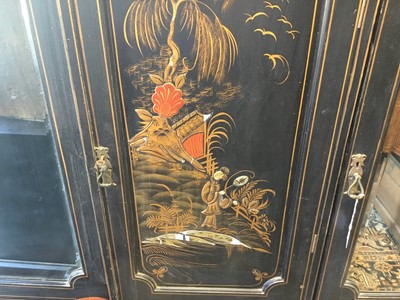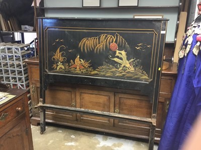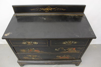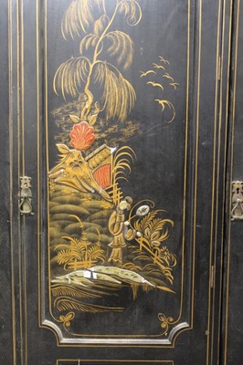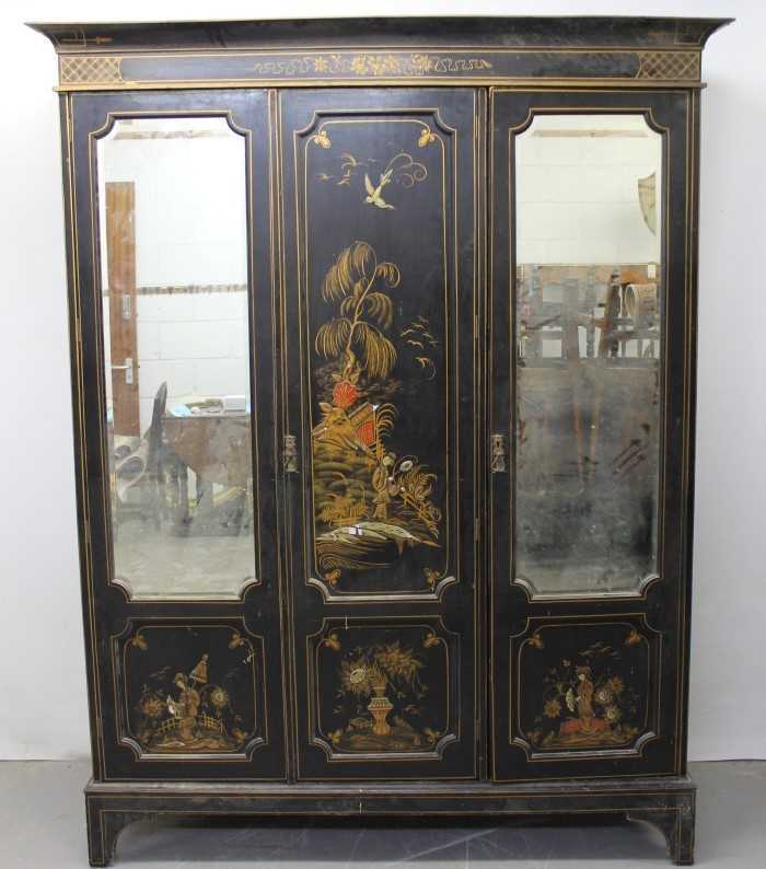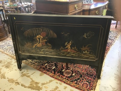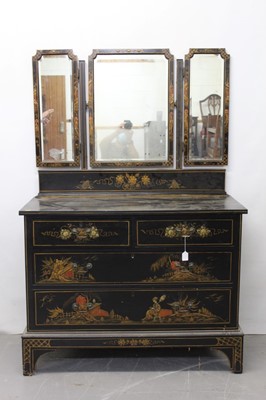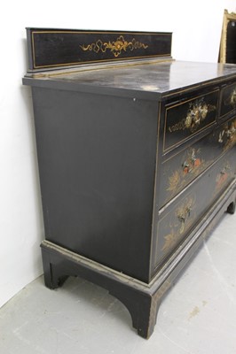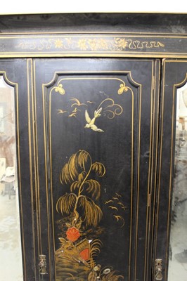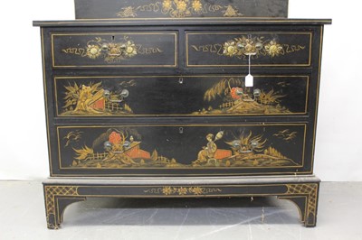 1920s Chinoiserie decorated black lacquered bedroom suite comprising double wardrobe 160cm wide x 205cm high, dressing chest with triple mirrors 114cm wide, chest of drawers, 114cm wide and bedstead 4'6". (4)