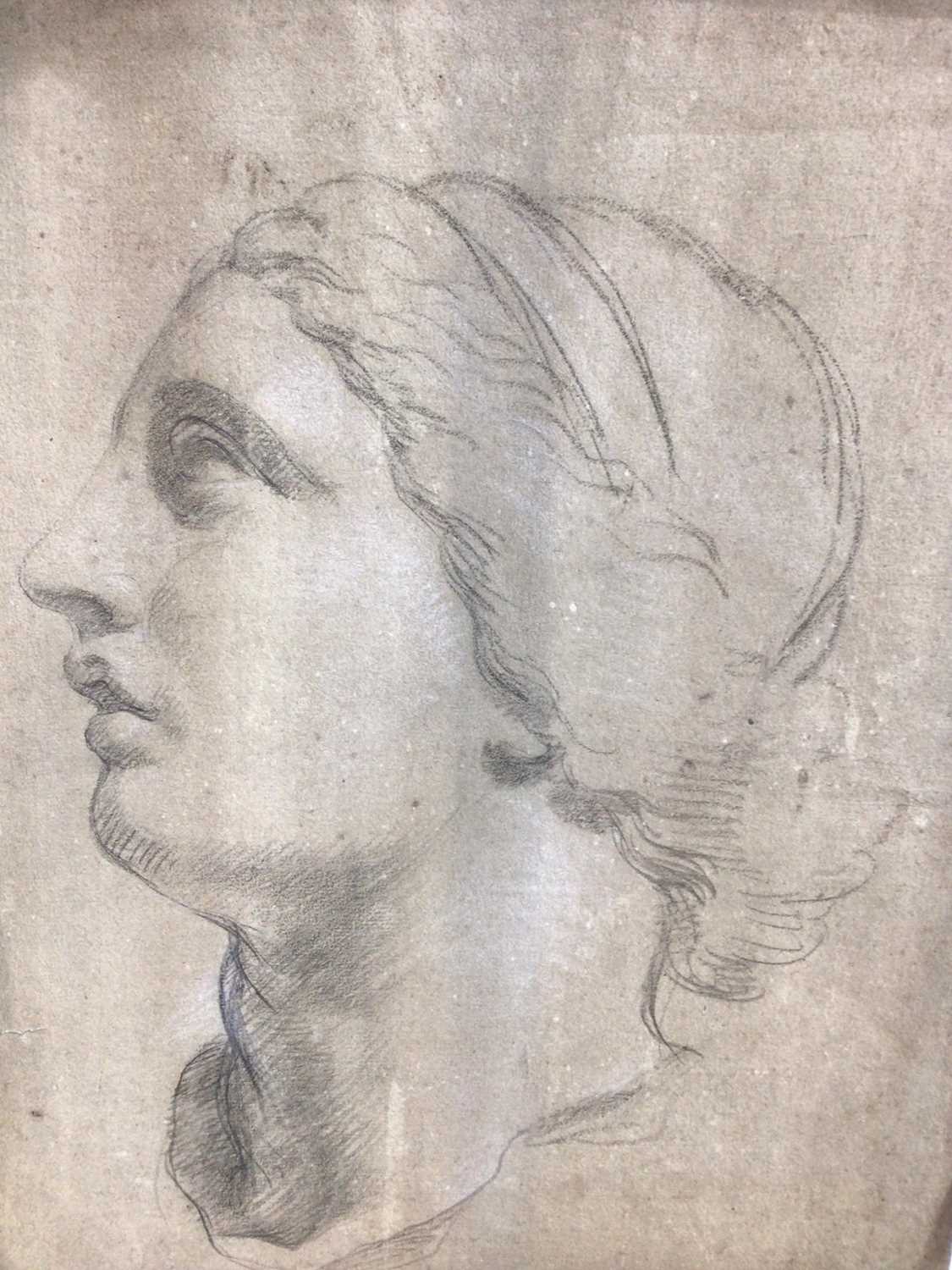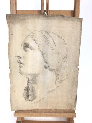 European School, 19th pencil drawing - a classical head, 40cm x 29cm, together with a circle of Claude Joseph Vernet (1714-1789) French School ink and wash head of a horse, 10.5cm x 14cm (2)