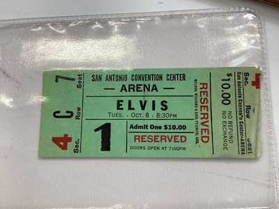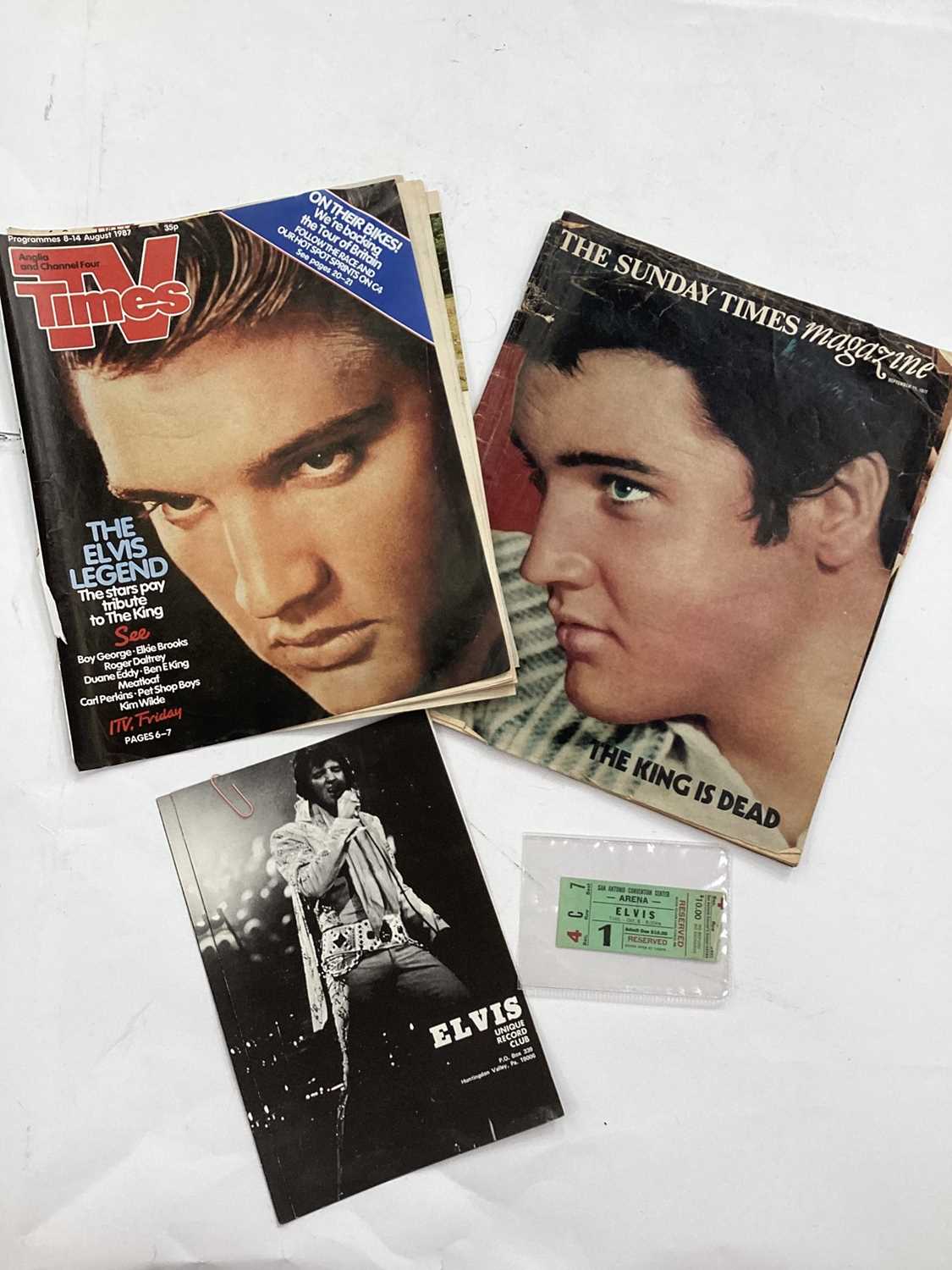 Elvis San Antonio Convention Centre Arena original ticket together with two Elvis unique record club flyers and a TV Times Elvis edition.