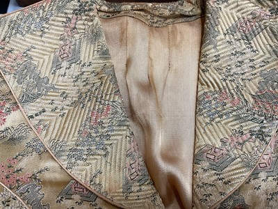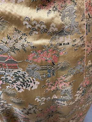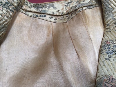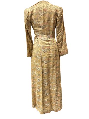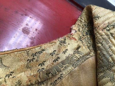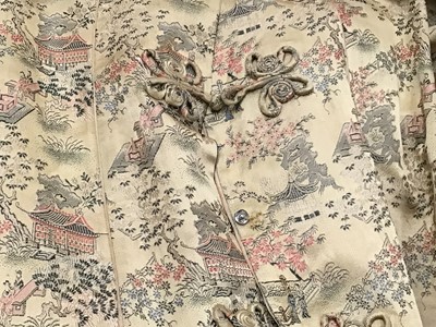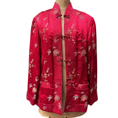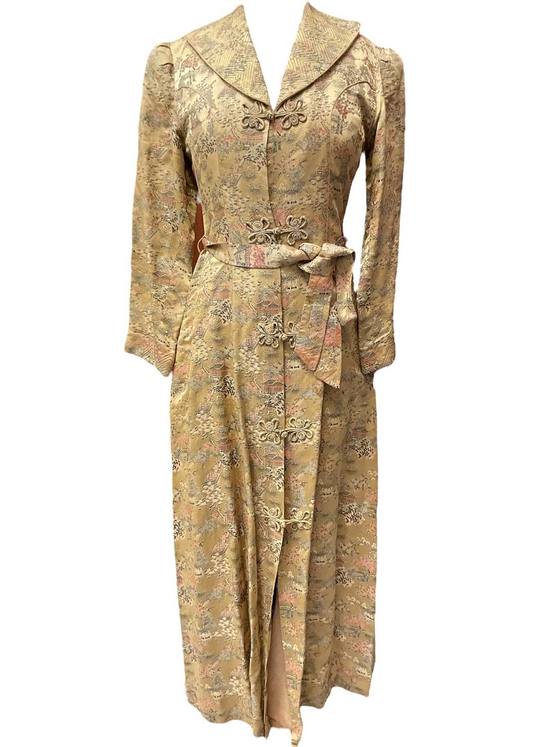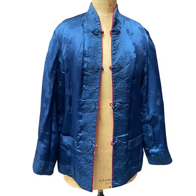 Vintage Chinese long, fitted dressing gown with quilted collar and padded shoulder seams, garden scenes on a gold ground. Loop and knot fastenings. Plus a mid century Chinese red and blue reversible jacket.
