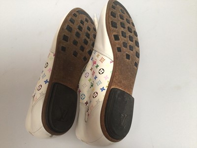 Pair of Louis Vuitton white leather multi coloured monogram trainers/ golf shoes, size 7, with spare pair of laces and Cole Haan wooden shoe trees