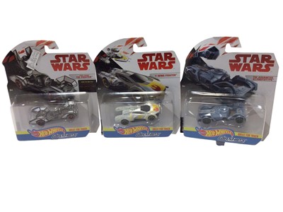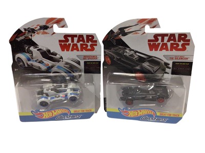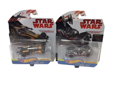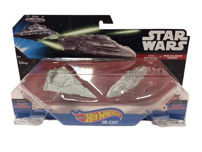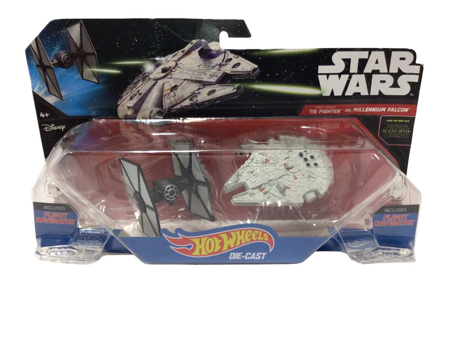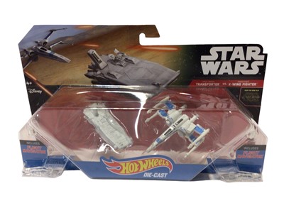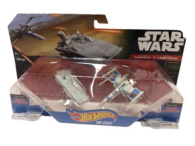 Mattel Star Wars Hotwheels including X Wing Fighter v Transporter (x2), Star Destroyer v Mon Calamari Cruiser, Tie Fighter v Millennium Falcon, plus Star Wars Carships series Hotwheels vehicles, all packaged (12 total)