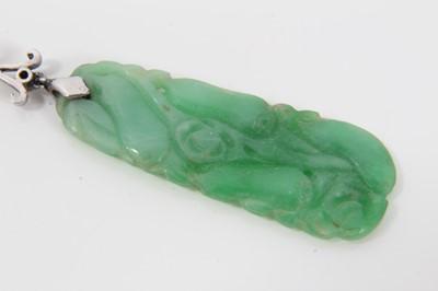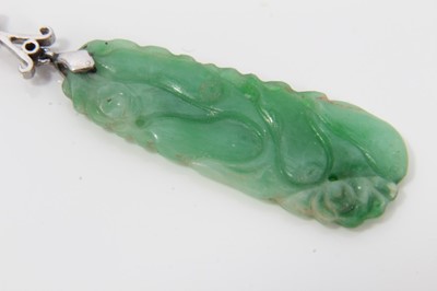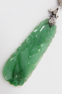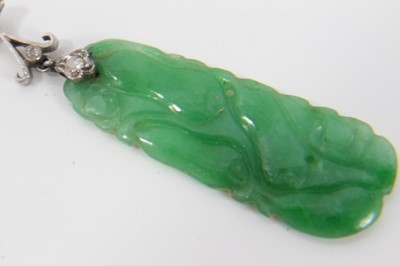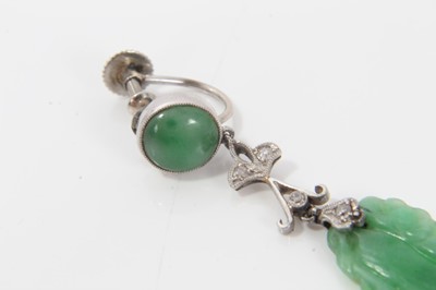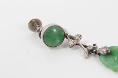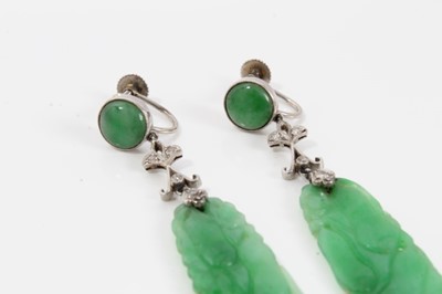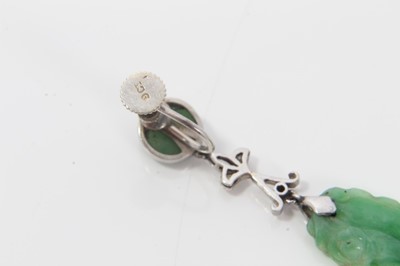 Pair of Chinese carved green jade pendant earrings, each with a carved and pierced jade plaque suspended from a jade cabochon, all with 9ct white gold and diamond mounts. 57mm length.