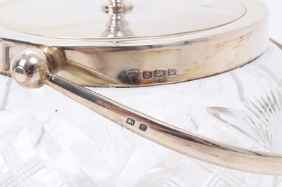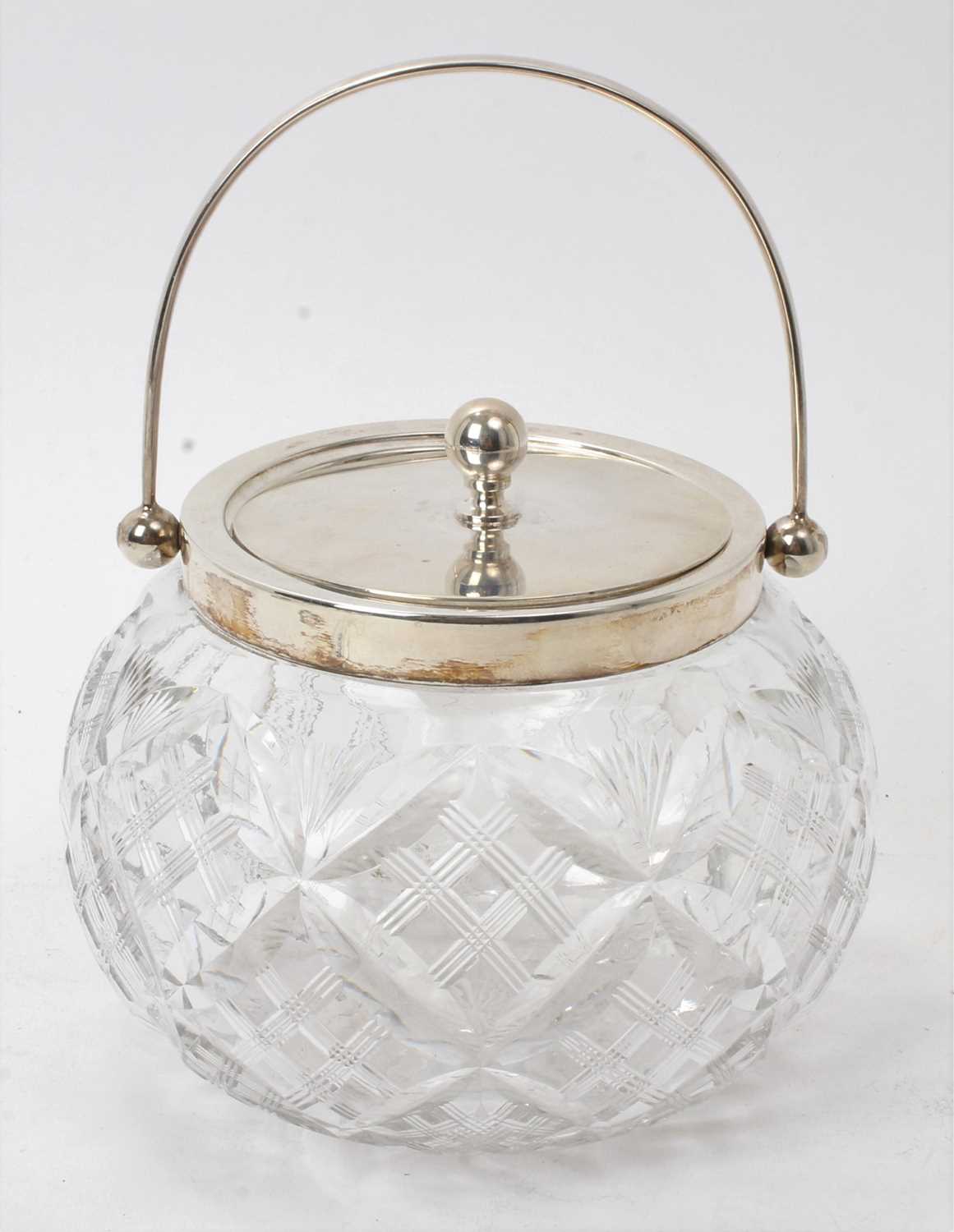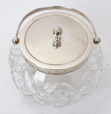 1920s silver mounted cut glass biscuit barrel of globular form with swing handle and slip in cover (Birmingham 1921) J Sherwood, 16.5cm diameter