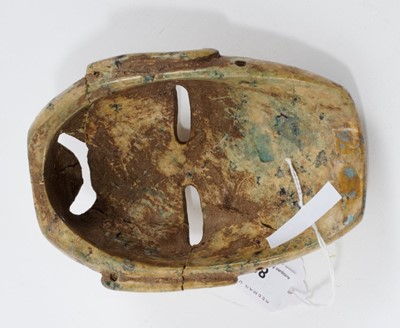 Ancient Pre-Colombian Olmec stone human mask with frowning expression and exposed teeth, the long ears pierced and with two side mounting holes, 15 cm high, 10.5 cm wide Provenance: Formerly the property of Mr Somerset de Chair (1911-1995) of St Osyth Priory, Essex - sold by these rooms in the residual sale of the contents of St Osyth Priory in the late 1990s. Mr de Chair was a connoisseur collector of antiquities and fine art.