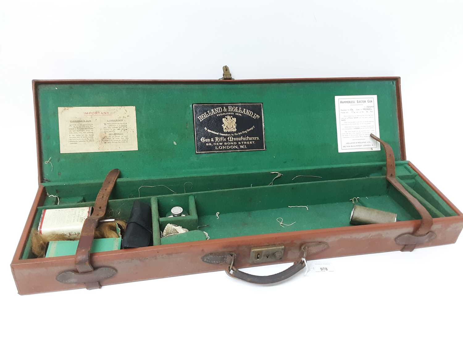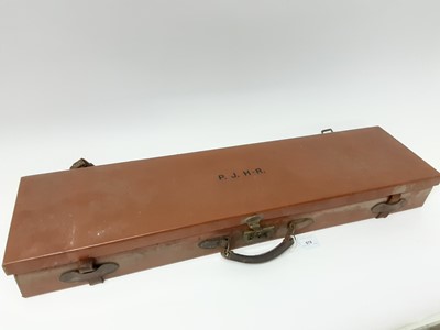Holland & Holland brown leather gun case with green felt interior containing various accessories to include a cleaning rod, oil bottles etc, bearing initials to lid P. J. H-R. 83cm long x 22cm wide