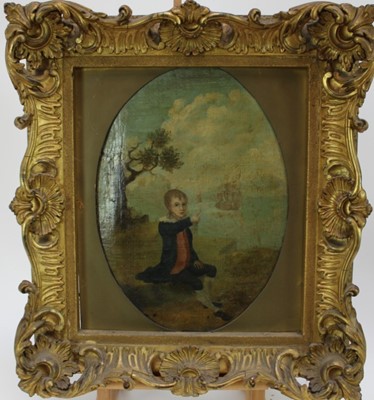 Lot 955 - English School, early 19th century, oil on canvas laid on panel - a child seated on a shore with a ship beyond, oval 38cm x 27cm, in good scroll gilt frame