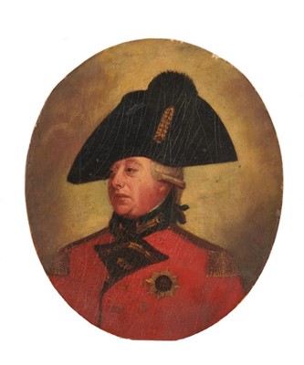 Lot 952 - After Sir William Beechey, early 19th century, oval oil on oak panel – portrait of George III, 30cm x 25.5cm, unframed