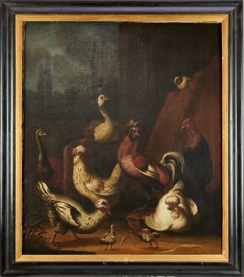 Lot 951 - Manner of Marmaduke Craddock, 18th century oil on canvas - fancy chickens and fowl, 76cm x 65cm, in gilt and ebonised frame