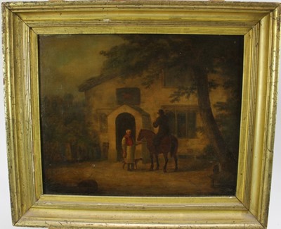 Lot 957 - Manner of George Morland, 19th century, oil on panel - figures and horse before a tavern, 24cm x 29cm, in gilt frame