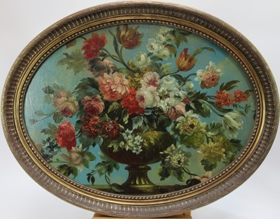 Lot 969 - Continental School, 19th century, oil on canvas laid on panel - stilllife profusion of summer flowers, oval, 44cm x 59cm, in gilt frame