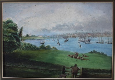 Lot 970 - English School, 19th century, watercolour - shipping on the river, Birkenhead, 23cm x 33cm, mounted