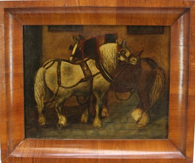 Lot 972 - Naive School, 19th century, oil on canvas - pair of heavy horses, 33cm x 42cm, in good quality walnut veneered frame