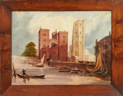 Lot 974 - English School, 19th century, oil on canvas - Lambeth Palace from the Thames, 44cm x 60cm, in 19th century pine frame
