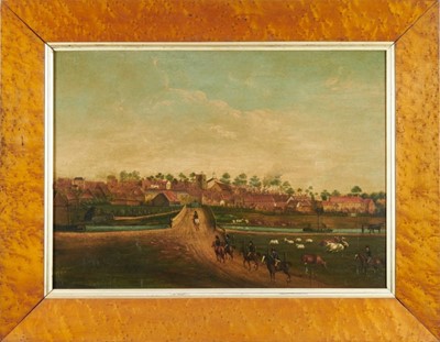 Lot 975 - English School, early 19th century, oil on panel - Town Panorama, 42cm x 59cm, in maple veneered frame