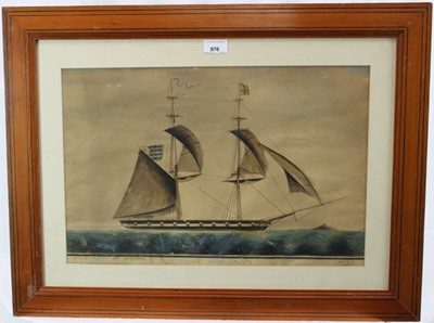 Lot 976 - Mid-19th century pen, ink and watercolour - ship portrait, indistinctly signed and titled, inscribed Buenos Ayres and dated 1845, 33cm x 50cm, in glazed frame