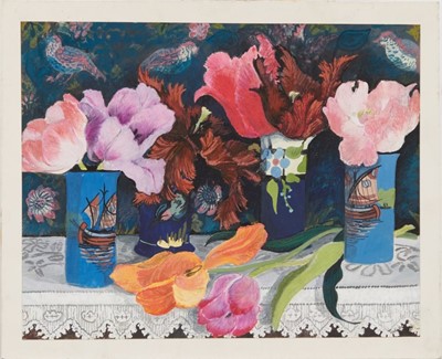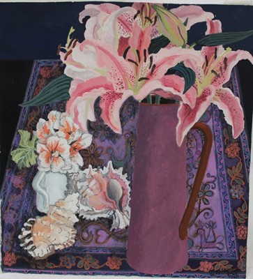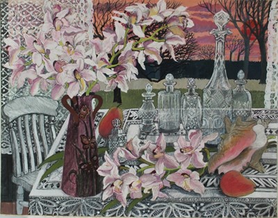 Lot 944 - *Dione Page (1936-2021) gouache and pastel on paper - still life with lilies, lace and glass, signed titled and dated '91, 77cm x 60cm, laid on card, unframed.