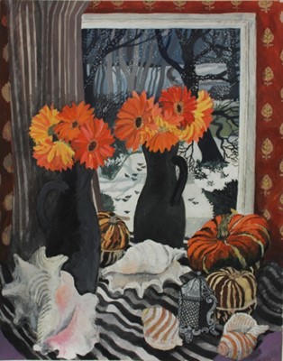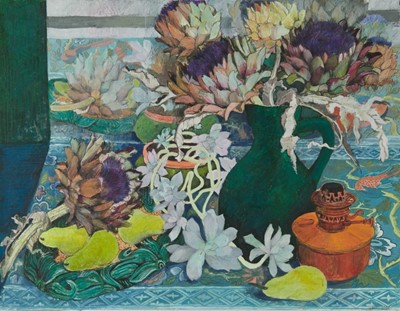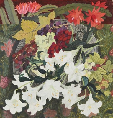 Lot 938 - *Dione Page (1936-2021) gouache and pastel on paper - 'Lilies and Grapes', signed titled and dated '04, 57cm x 60cm, unframed.