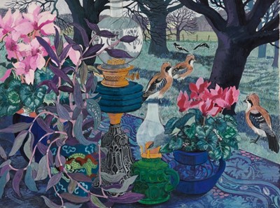 Lot 940 - *Dione Page (1936-2021) gouache and pastel on paper - 'Birds in the Garden', signed titled and dated '95, 79cm x 60cm, laid on card, unframed.