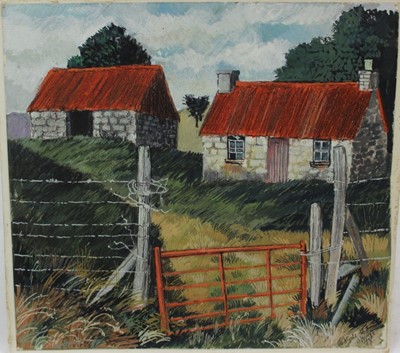 Lot 942 - *Dione Page (1936-2021) gouache and pastel on paper - 'Red gate and roof', signed titled and dated '97, 27cm x 25cm, laid on card, unframed.