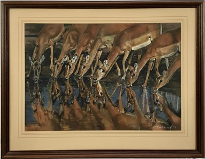 Lot 282 - P M Palmer, pastel of female gazelles at a watering hole '92