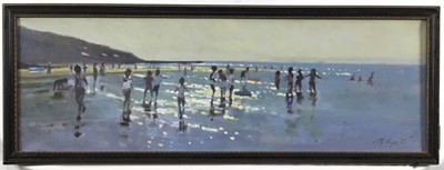 Lot 256 - Peter Z. Phillips, oil on canvas, Children playing at the beach in the sunshine, signed, in Hogarth frame. 60 x 20cm.