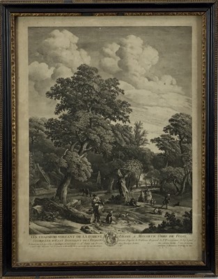 Lot 264 - 18th century engraving "Les Chasseurs Sortant de la Forest", J. Moyreau after Wouvermans, published 1745, 51cm x 38.5cm, in hogarth frame