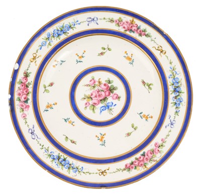 Lot 74 - Formerly the property of Napoleon Bonaparte whilst captive on St Helena, late 18th century Sevres porcelain plate with polychrome painted floral sprays within blue and gilt bands, blue painted m...