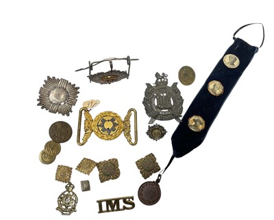 Lot 51 - Victorian King's Own Scottish Borderers silver officer's cap badge, together with an ormolu Scots Guards officers belt buckle, other Scots Guards badges and related militaria. Provena...