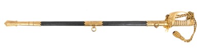 Lot 67 - Good George VI Naval Officer's dress sword with gilt lion's head pommel, wire bound shagreen grips, Gothic guard with crowned fouled anchor and original bullion dress knot, etched fullered blade...