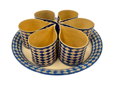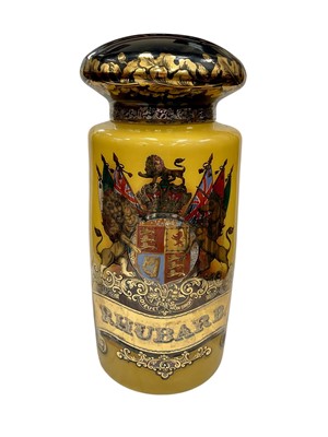 Rhubarb and Custard – Lot 1486 is a very large and impressive painted and emblazoned glass Rhubarb apothecary jar and cover, signed Maw & Son. London.  By contrast, the smaller lot 4, a rare Staffordshire caneware custard set, circa 1800, comprising tray and six cups, is decorated with a strikingly contemporary-looking lozenge pattern, painted in blue enamel, and would elevate the simplest of puddings.